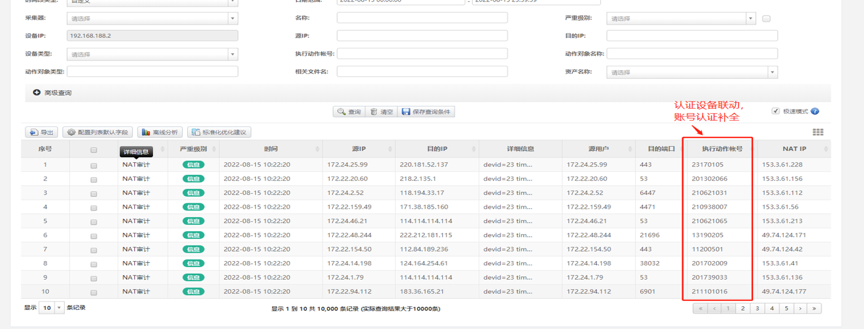 NAT实名审计:校园出口设备做了NAT转换,出现问题要溯源时无法找到真实的责任人,需要对大出口NAT等做转换日志找到真实地址,并和实名认证设备联动认证。